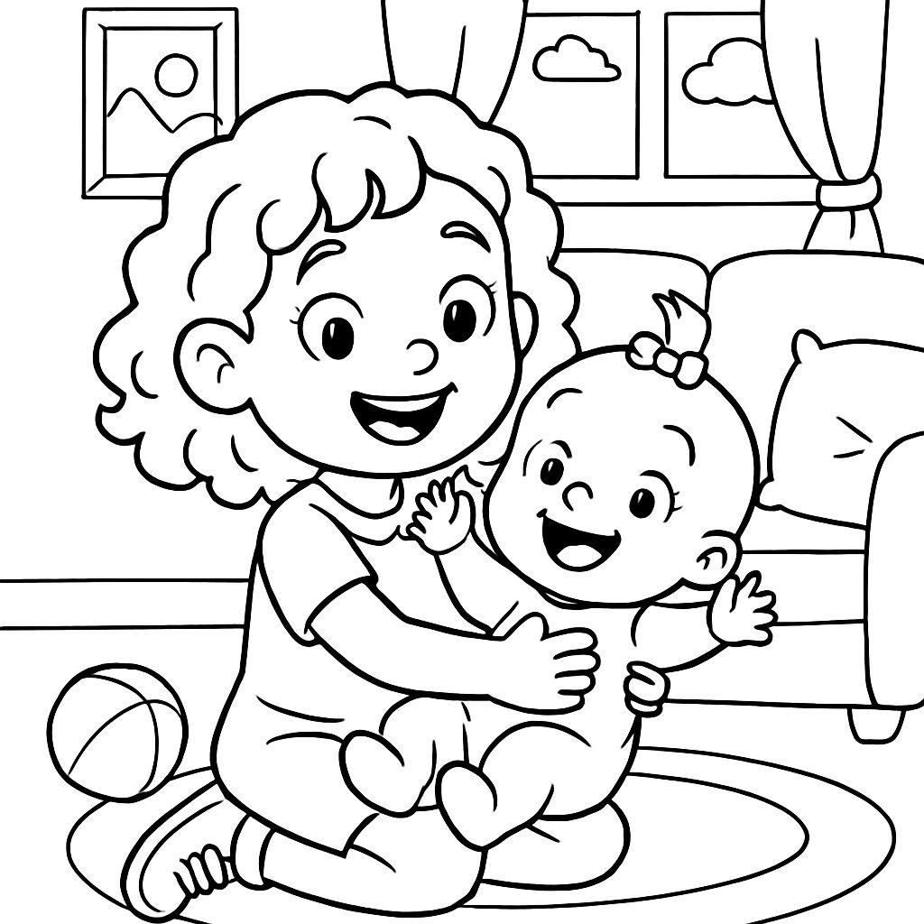 zwei Schwestern, eine ist 6 mit lockigem, schulterlangem Haar, die andere ist ein Baby