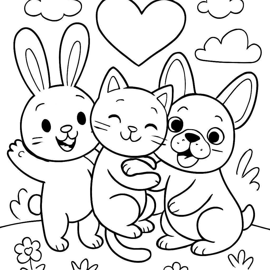 Häschen, Kätzchen und französischer Bulldoggenhund mit einem Herz.