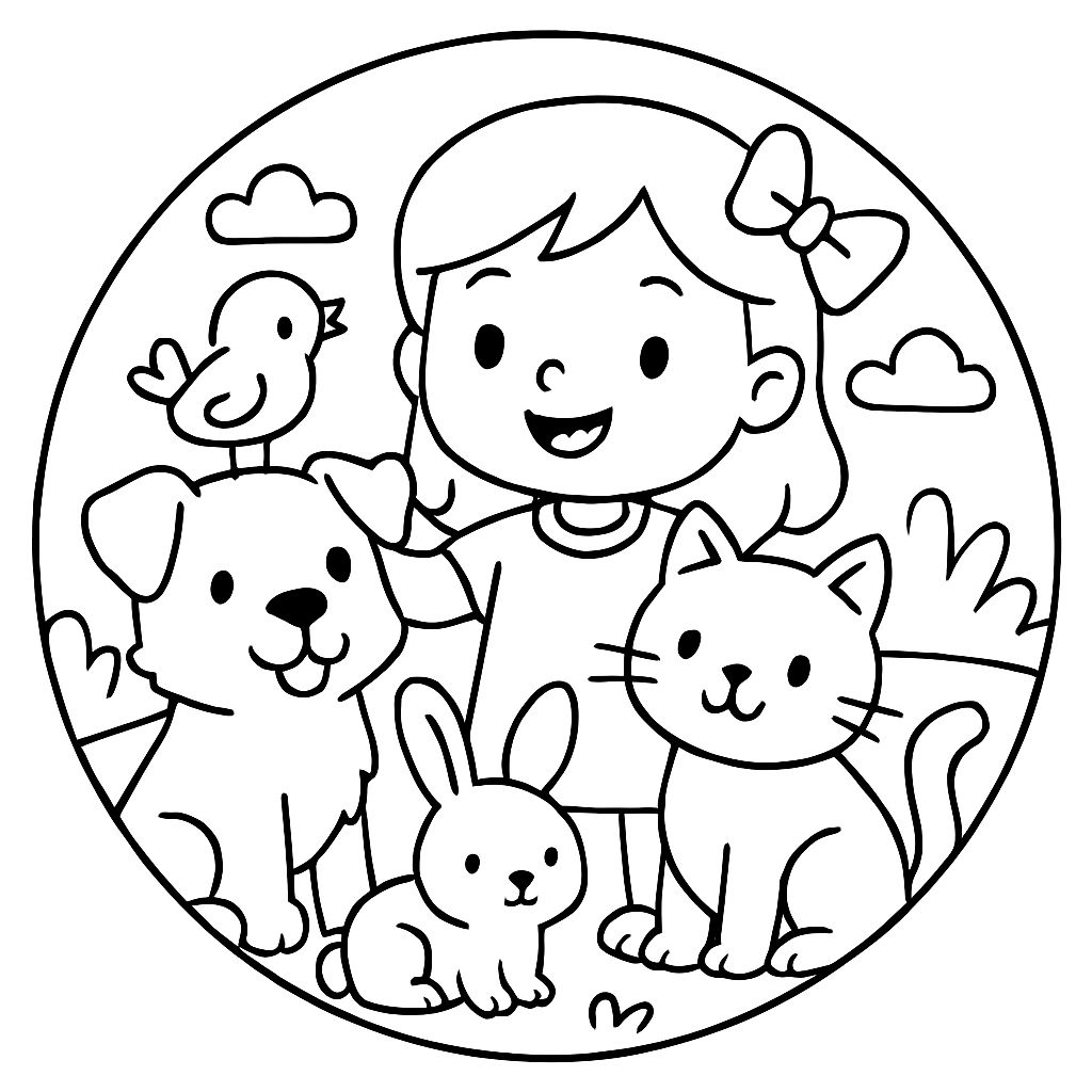 Ein tabby Katze und ein Labrador Retriever sind zusammen in einer Szene dargestellt. Diese Illustration bietet Kindern die Möglichkeit, ihre Kreativität durch Ausmalen auszudrücken.