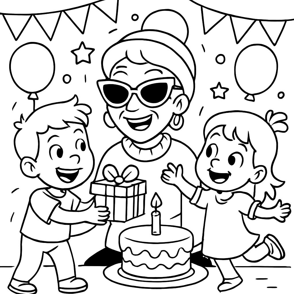 Ein 6-jähriger Junge und ein 4-jähriges Mädchen mit einer coolen Oma an ihrem Geburtstag