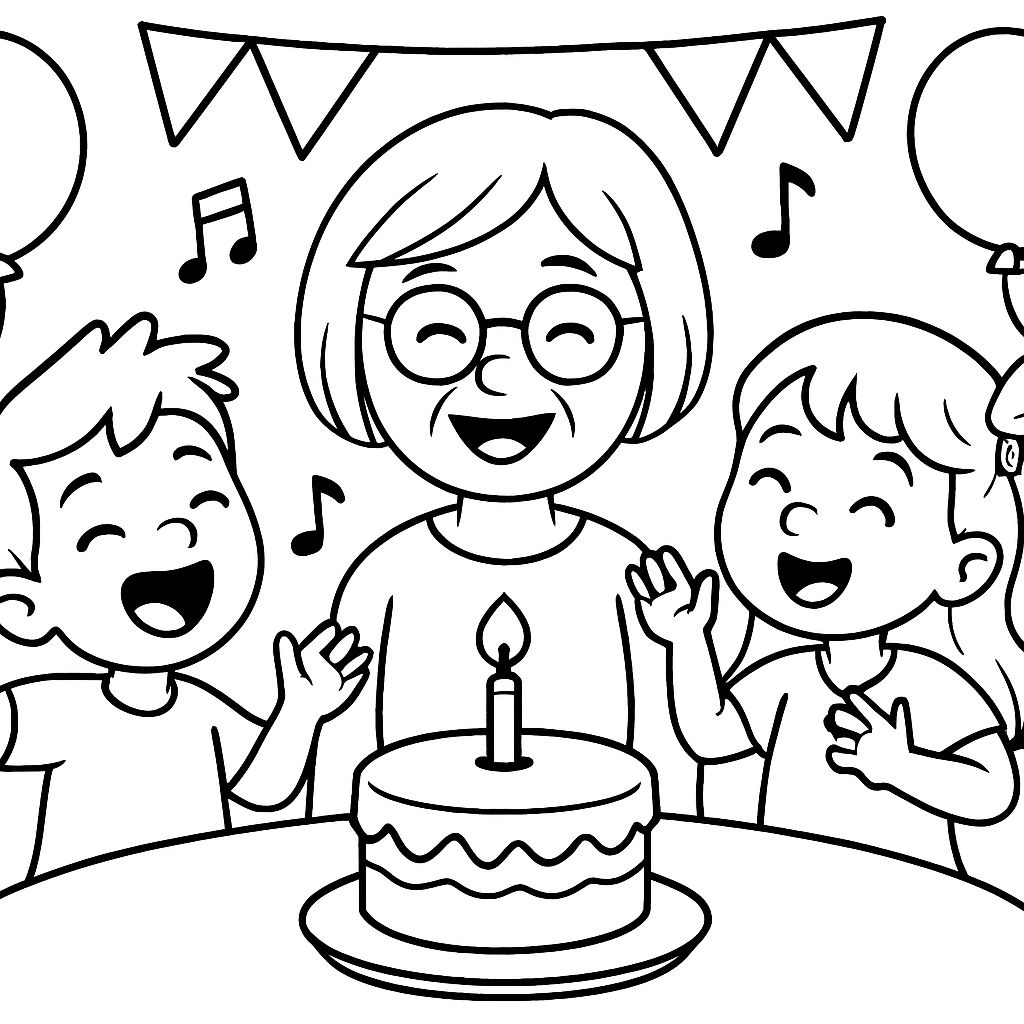 Junge und Mädchen singen ihrer jungen Großmutter, die eine kurze Bobfrisur hat, ein Geburtstagslied.