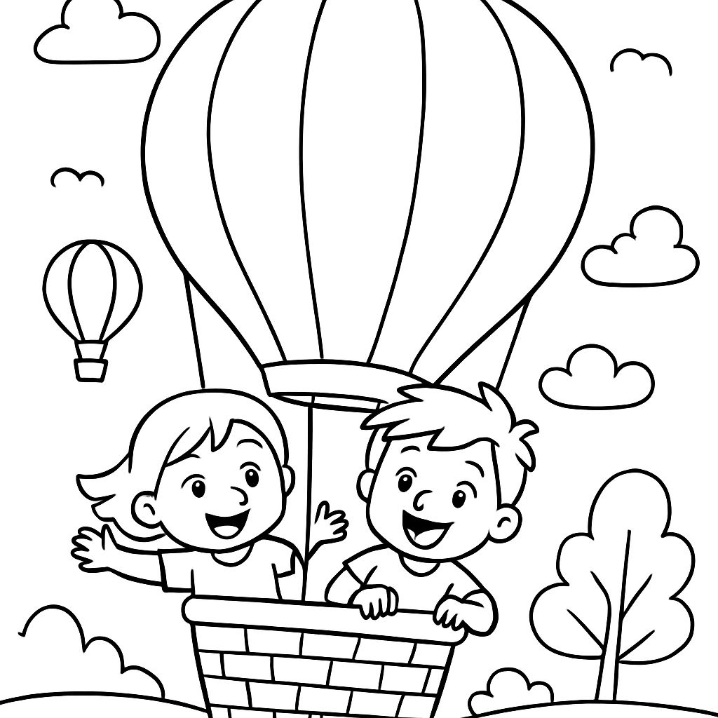 A little girl and her grandma and a small excavator all riding together in a hot air balloon.