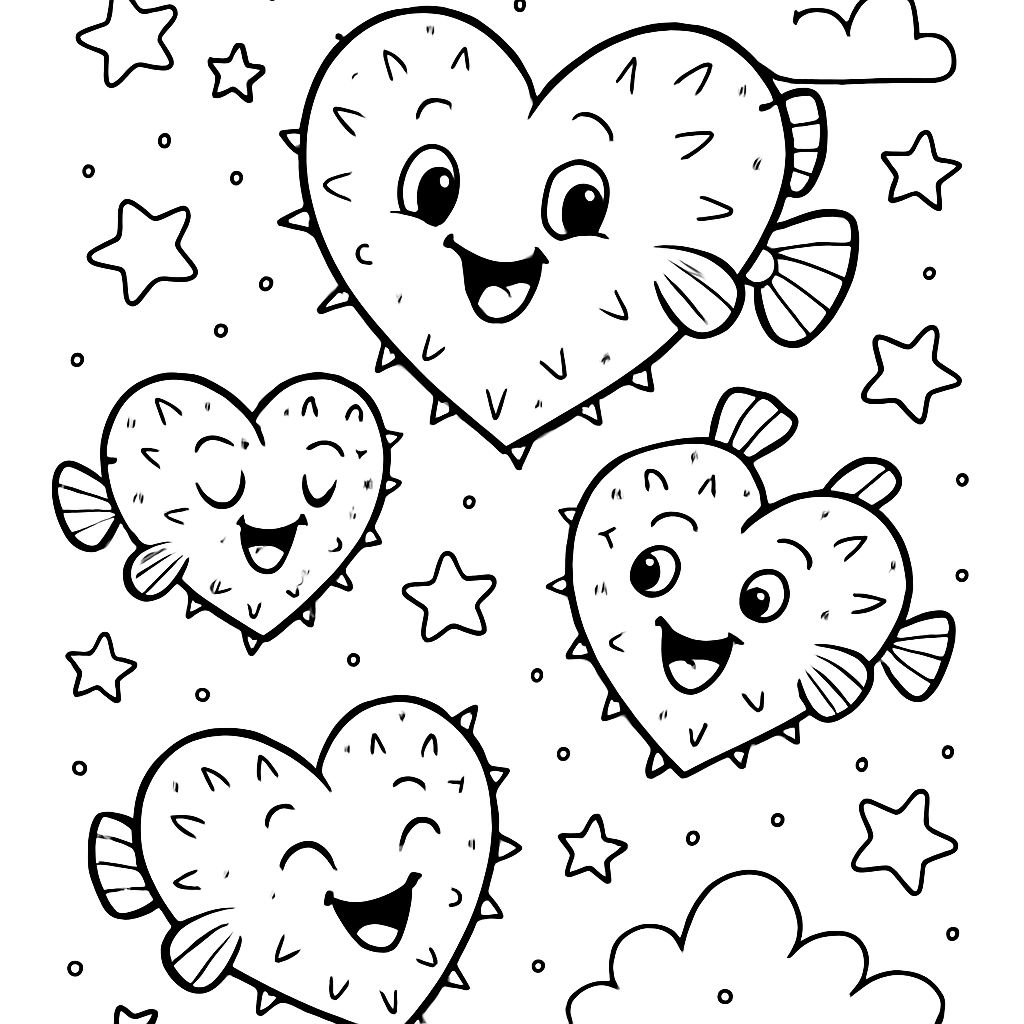 A bunch of happy heart-shaped puffer fish floating in the starry sky.