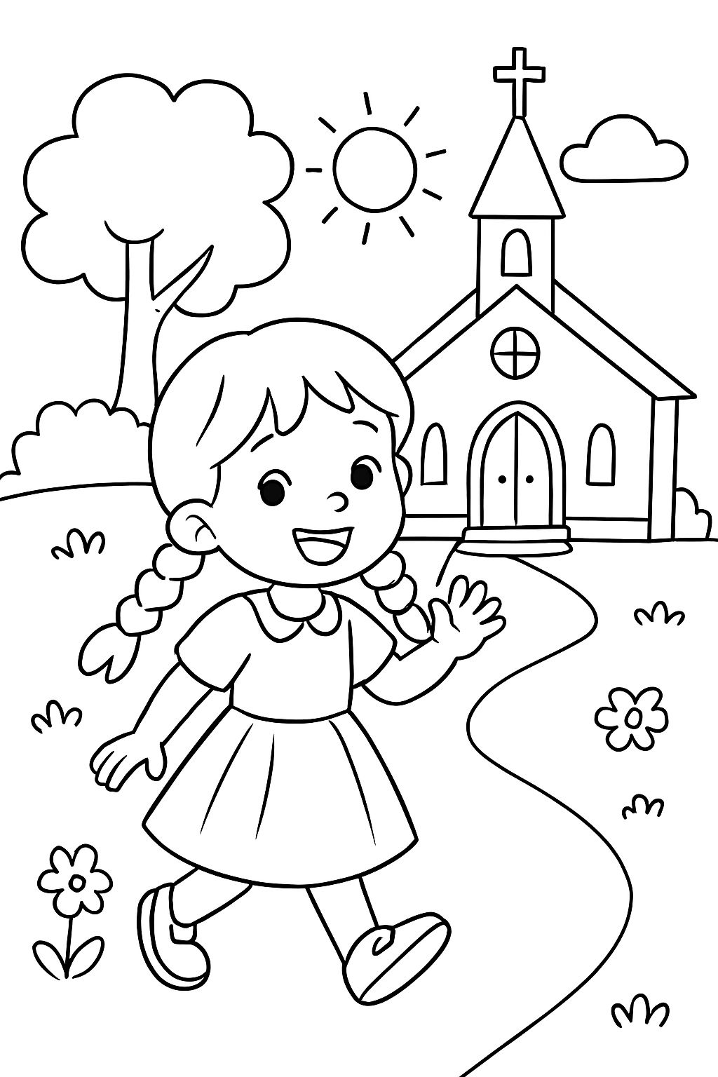 Descubre nuestra página para colorear gratuita 'Niña de 3 años con un vestido y trenzas yendo a la iglesia.' para imprimir. Creada con IA y perfecta para momentos creativos - ya sea en casa, en el jardín de infantes o en la escuela. ¡Toma tus lápices y comencemos!