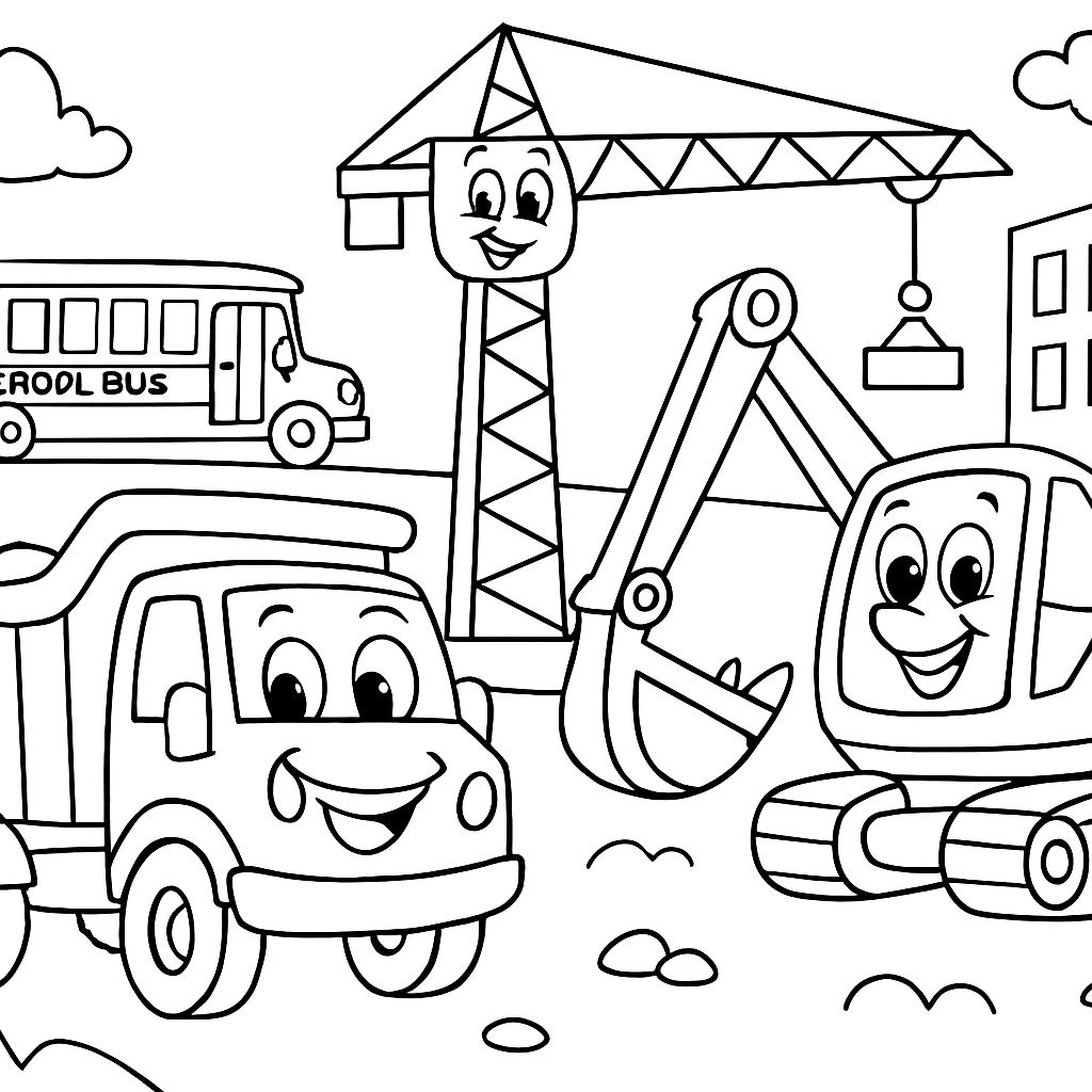 Un camion-benne, une grue et une excavatrice sur un chantier, alors qu'un bus scolaire passe.