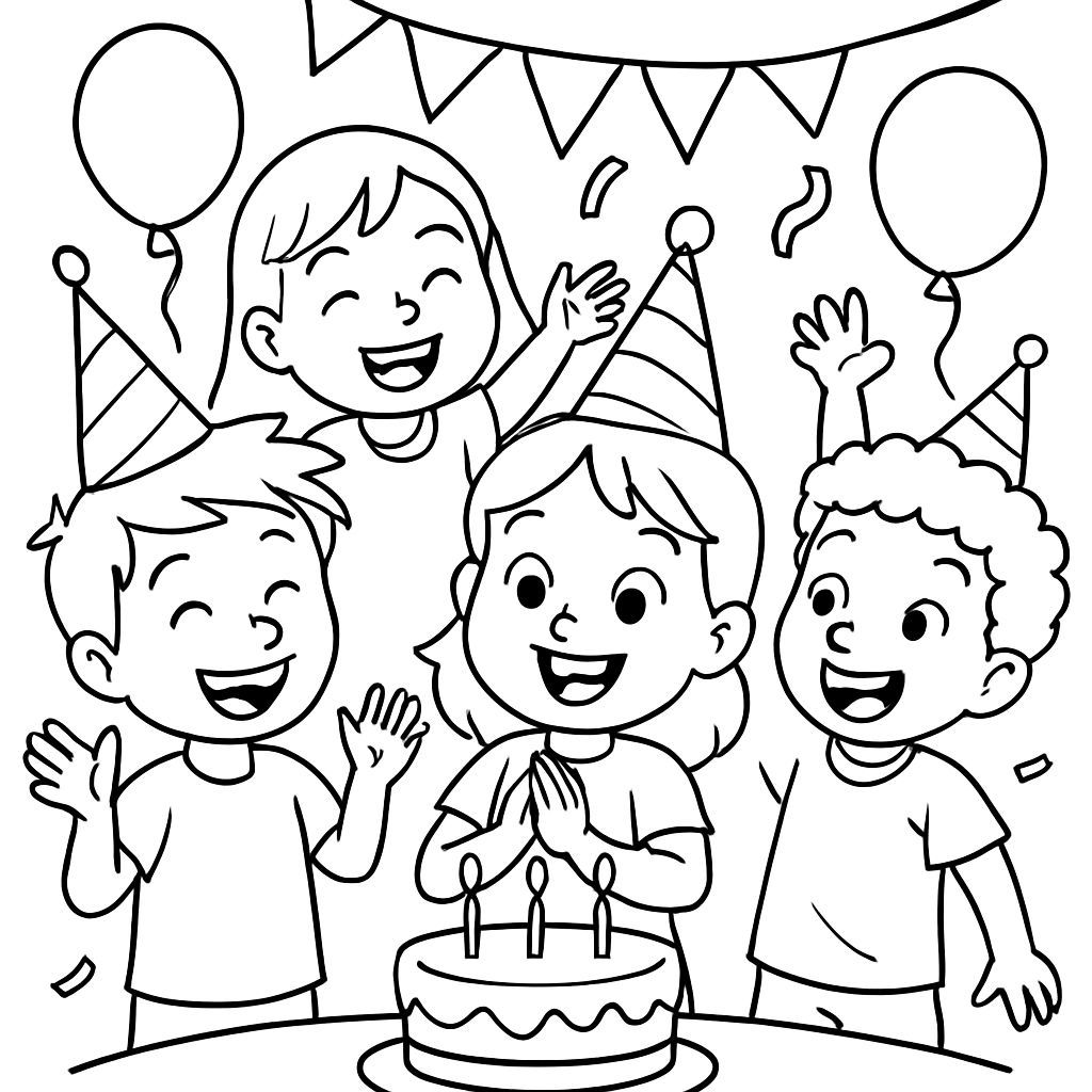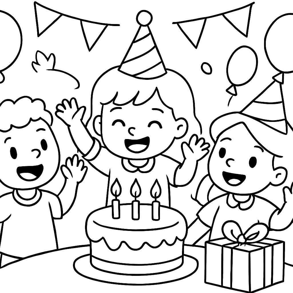 Une scène avec une licorne à une fête d'anniversaire, entourée de ballons colorés.