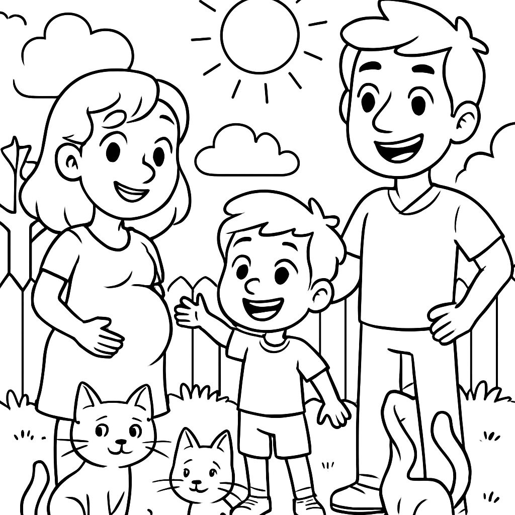 Crie uma página de colorir para crianças em um fundo branco mostrando uma família com uma mãe grávida, um pai e um menino pequeno. Eles têm dois gatos sentados no chão ao lado deles, um gato tem listras e o outro gato tem pelo liso. O menino pequeno está segurando um dragão barbudo.