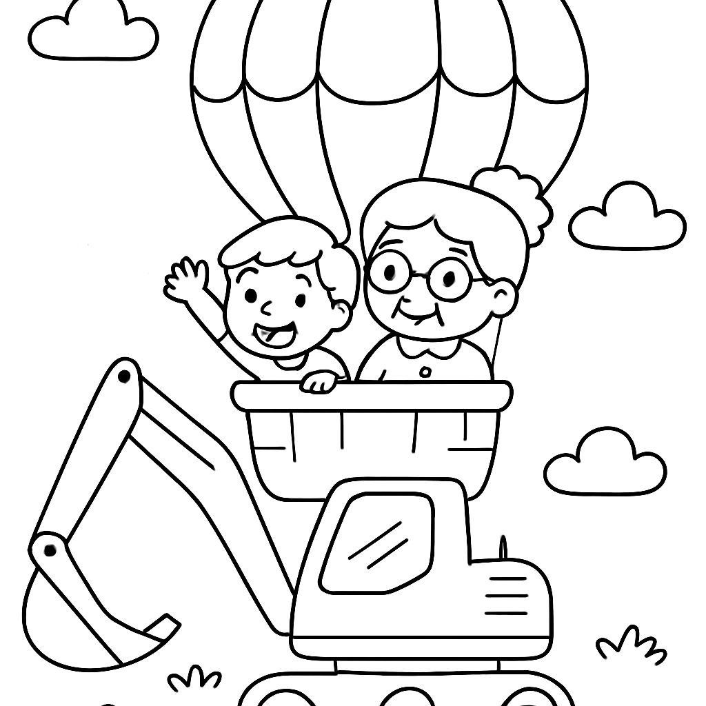Uma criança e uma avó em um balão de ar quente voando sobre um escavador.