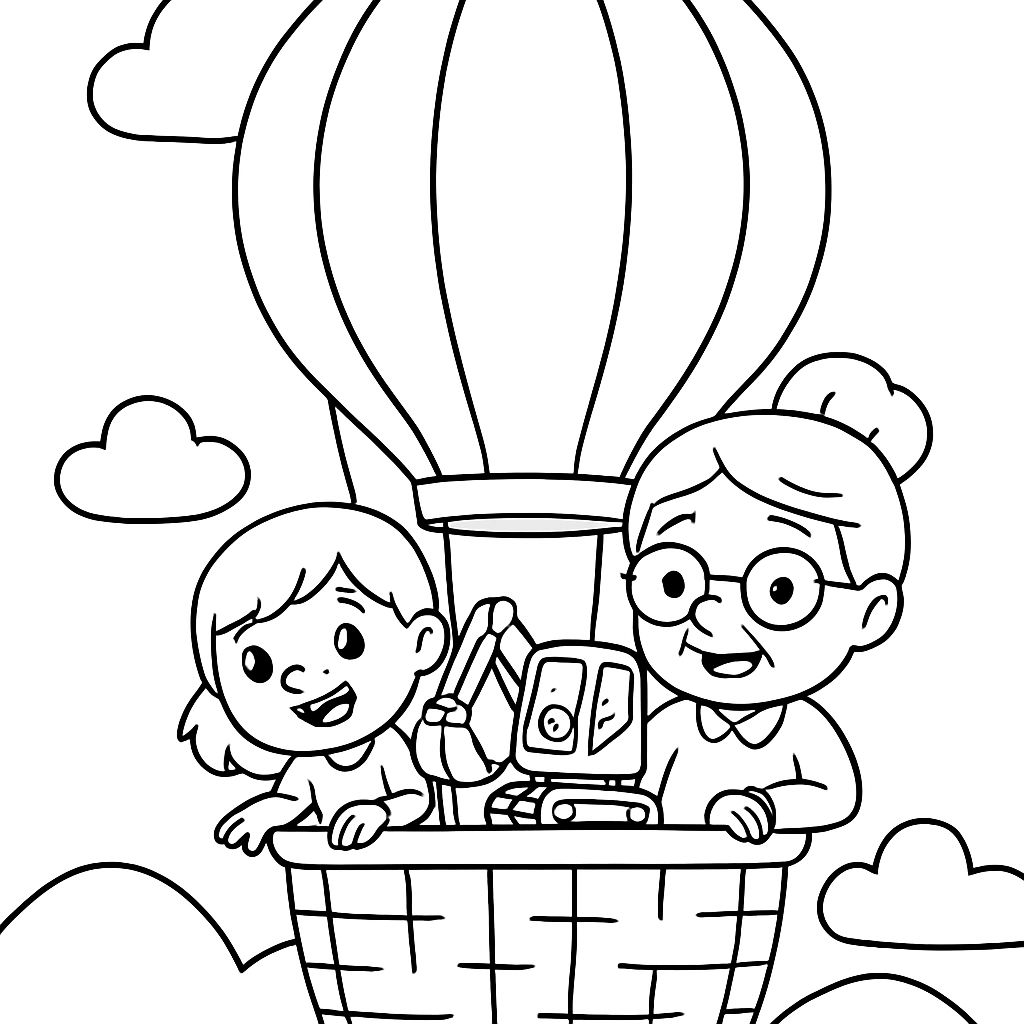 Uma menina pequena, sua avó e uma pequena escavadora viajando juntos em um balão de ar quente.